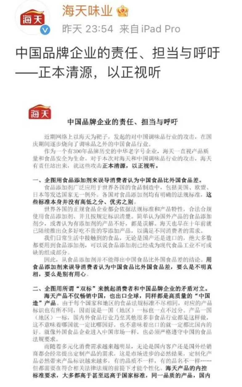 10月5日,海天味業(yè)再次發(fā)布第二份聲明《中國品牌企業(yè)的責任、擔當與呼吁——正本清源,以正視聽》,稱食品添加劑廣泛應(yīng)用于各國的食品制造中,各企業(yè)按照各國標準和產(chǎn)品特性合法合規(guī)使用食品添加劑,海天售賣的國內(nèi)國外產(chǎn)品內(nèi)控標準是一致的,并未“雙標”!坝檬称诽砑觿﹣碚`導消費者認為中國食品比外國食品差,要么是不明真相,要么是別有用心!