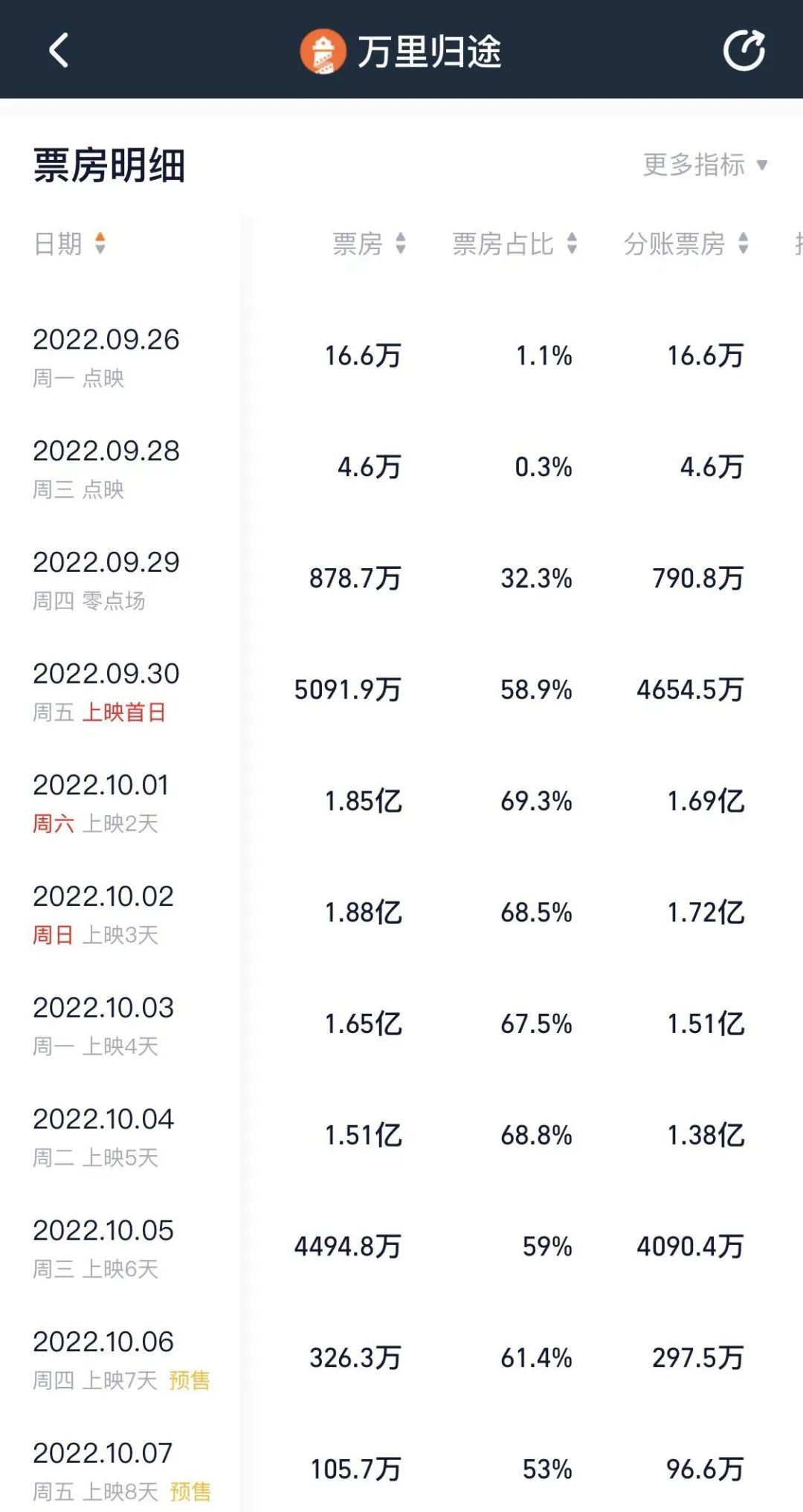 扣除《長空之王》的預售票房后,根據(jù)貓眼專業(yè)版數(shù)據(jù)顯示,截至9月30日20時56分,2022年國慶檔(10月1日-10月7日)預售票房破5000萬。電影《萬里歸途》票房占比最高。
