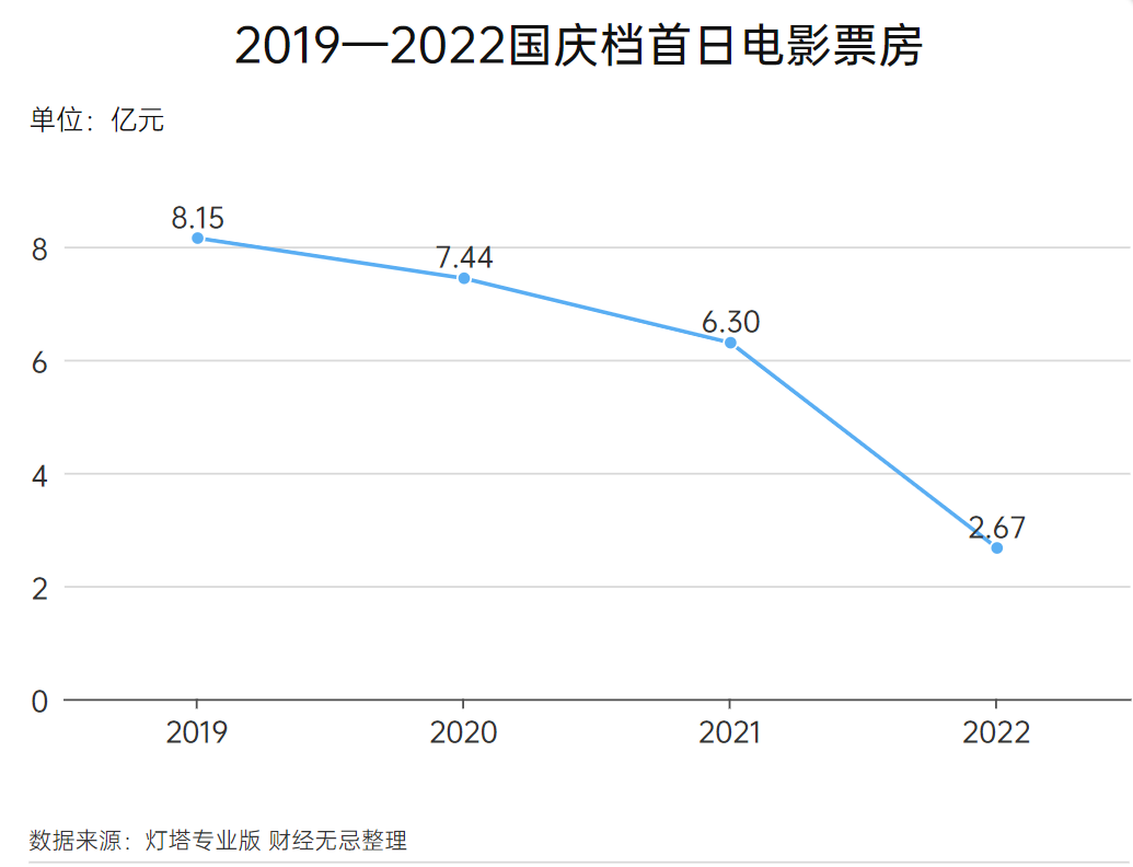 2020-2022年,國慶檔首日(10月1日)票房表現(xiàn)分別為7.44億元、6.30億元與2.67億元,疫情前的2019年10月1日票房為8.15億元。