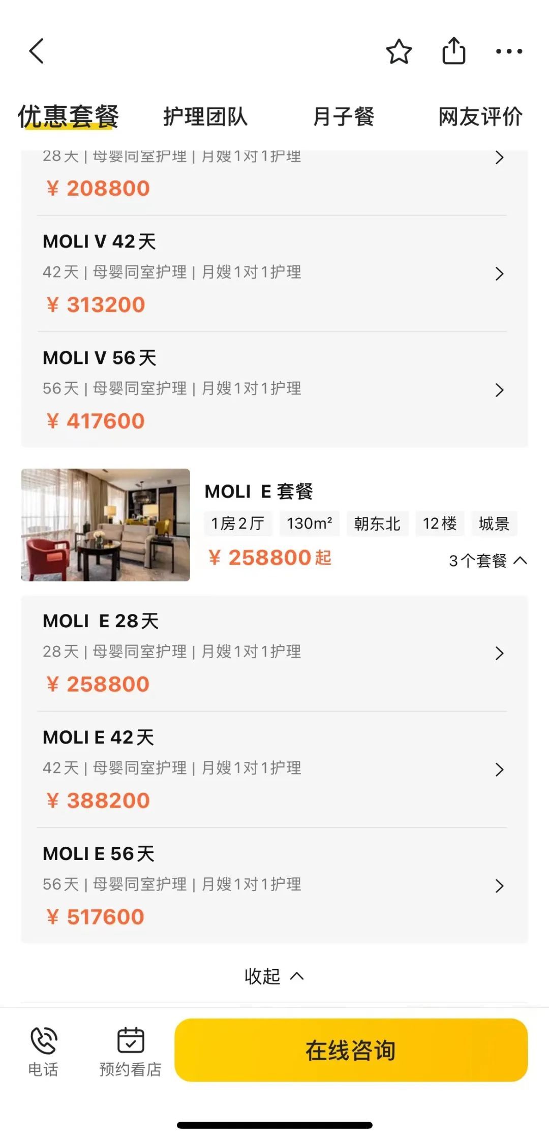 門店28天月子套餐價(jià)格從10.88萬-25.88萬不等,其中最貴的一款是56天套餐,價(jià)格高達(dá)51.76萬元。