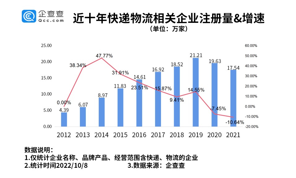 企查查數(shù)據(jù)顯示,我國現(xiàn)存快遞物流相關(guān)企業(yè)超122萬家。2017年我國新增快遞物流相關(guān)企業(yè)16.92萬家,同比增長15.87%。2018年新增18.52萬家,同比增長9.41%。2019年新增快遞物流相關(guān)企業(yè)21.21萬家,同比增長14.55%,是近10年來新增最多的一年。2020年新增19.63萬家,同比減少7.45%。2021年新增17.54萬家,同比減少10.64%。