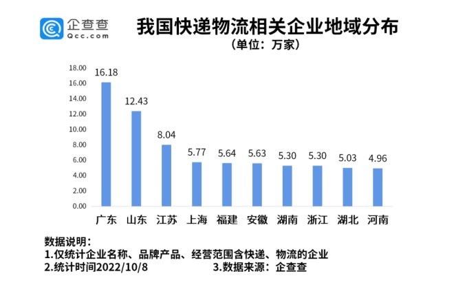 企查查數(shù)據(jù)顯示,從區(qū)域分布來看,廣東以16.18萬家快遞物流相關(guān)企業(yè)排名第一。山東、江蘇分別有12.43萬家、8.04萬家快遞物流相關(guān)企業(yè),位居前三。此后依次為上海、福建、安徽等省份。
