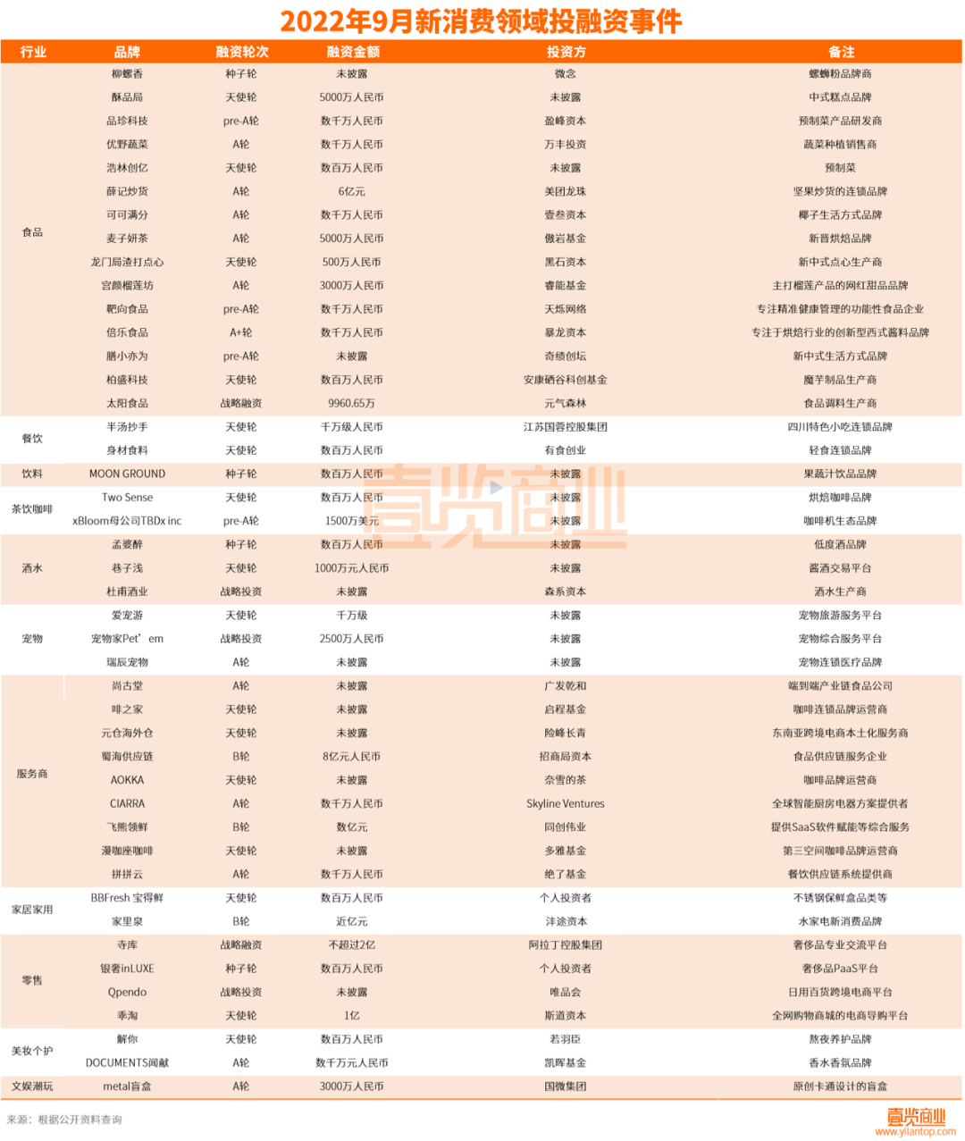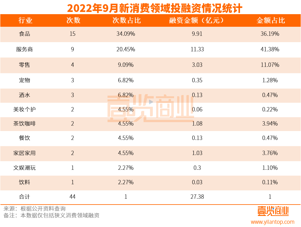 從賽道來看,9月份的融資事件主要集中在食品、服務(wù)商和零售賽道,各領(lǐng)域的融資事件分別達到15起、9起、4起。