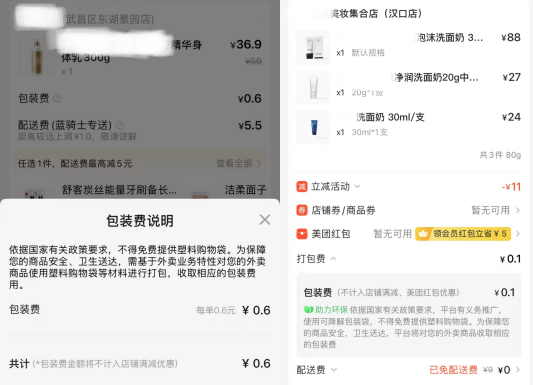 青眼采訪多家主流美妝店相關(guān)工作人員,大多表示不了解外賣平臺(tái)包裝費(fèi)定價(jià)規(guī)則,“包裝品的定價(jià)與外賣平臺(tái)有關(guān),門店只負(fù)責(zé)接收訂單并進(jìn)行送出!