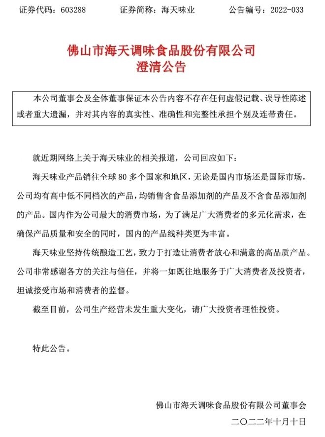 10月9日,就近期網(wǎng)絡(luò)上關(guān)于海天味業(yè)的相關(guān)報道,海天味業(yè)發(fā)布澄清公告。