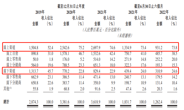 目前,上美集團(tuán)對第三方電子商務(wù)平臺(其中包括如天貓、京東及唯品會等)的依賴程度較高,根據(jù)招股書,上美集團(tuán)73.8%的收入來自線上渠道,而線下渠道占比僅24.6%。