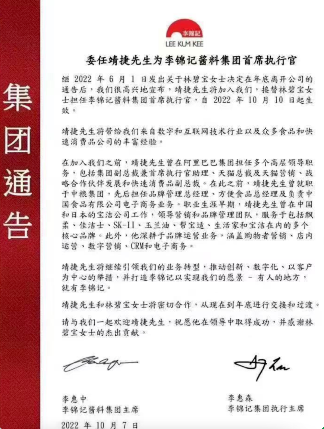 李錦記發(fā)布的集團(tuán)通告,其中暗含不少信息。