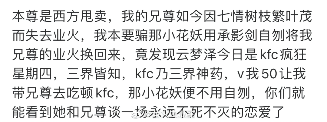 每隔一段時間,跟肯德基瘋狂星期四有關的梗和段子,就會收割一波關注度,真是百讀不厭,常讀常新。