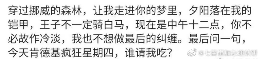 最初的瘋四文學,是有模板的,比如選擇一些網(wǎng)絡小說、歌詞等里面的片段,再加上標志性結尾“今天肯德基瘋狂星期四,誰請我吃?”就算完成。