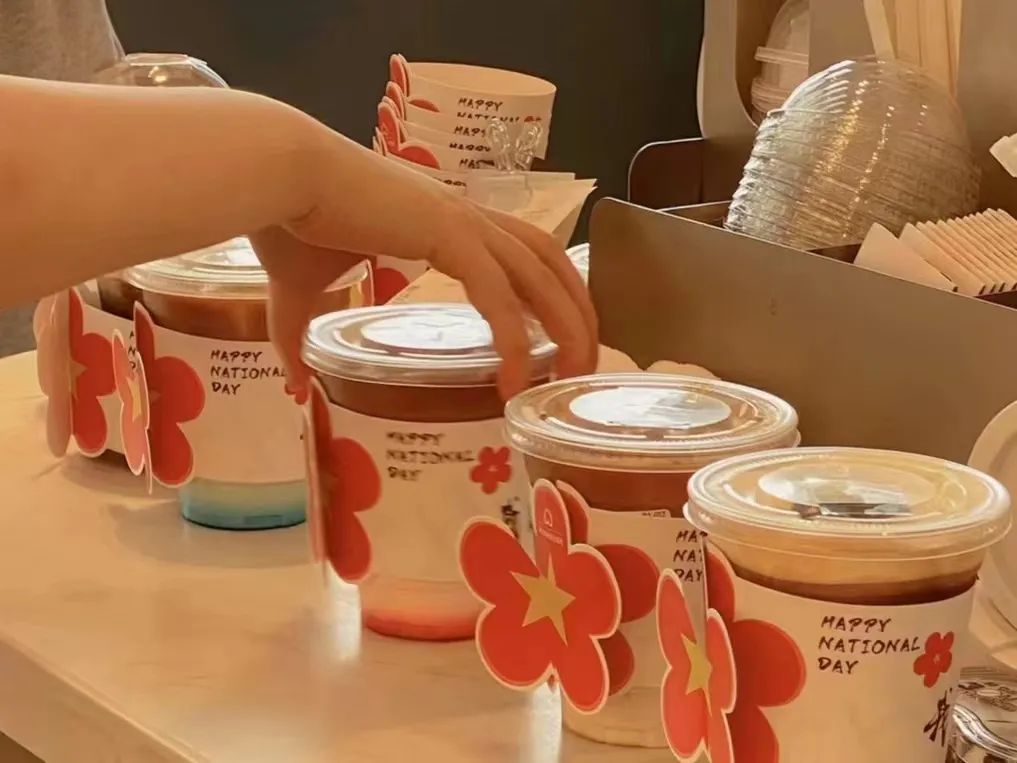比如剛過去的國慶節(jié)推出“我愛我的祖國”和五角星小紅花設(shè)計(jì)杯套,春節(jié)是虎年主題杯套,三八婦女節(jié)會推出鮮花套盒,教師節(jié)配送學(xué)校的單子會在杯子貼上一支鮮花。