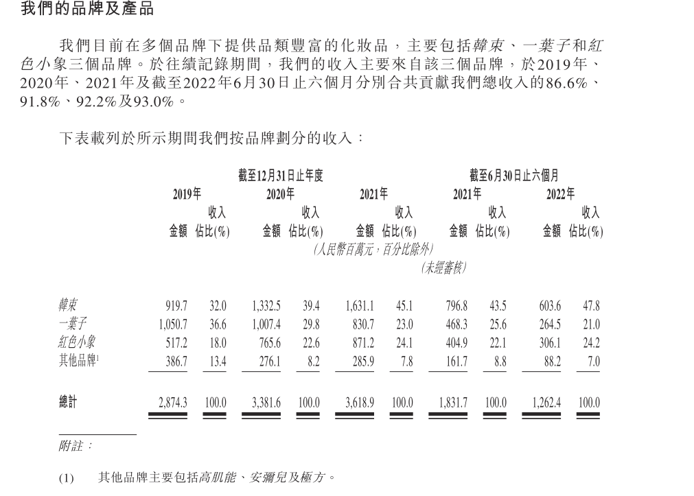 公司的主要收入,由韓束、紅色小象、一葉子三大品牌貢獻。2021年,以上品牌對公司收入的貢獻率分別為45.1%、24.1%和23.0%,其余品牌為7.8%。