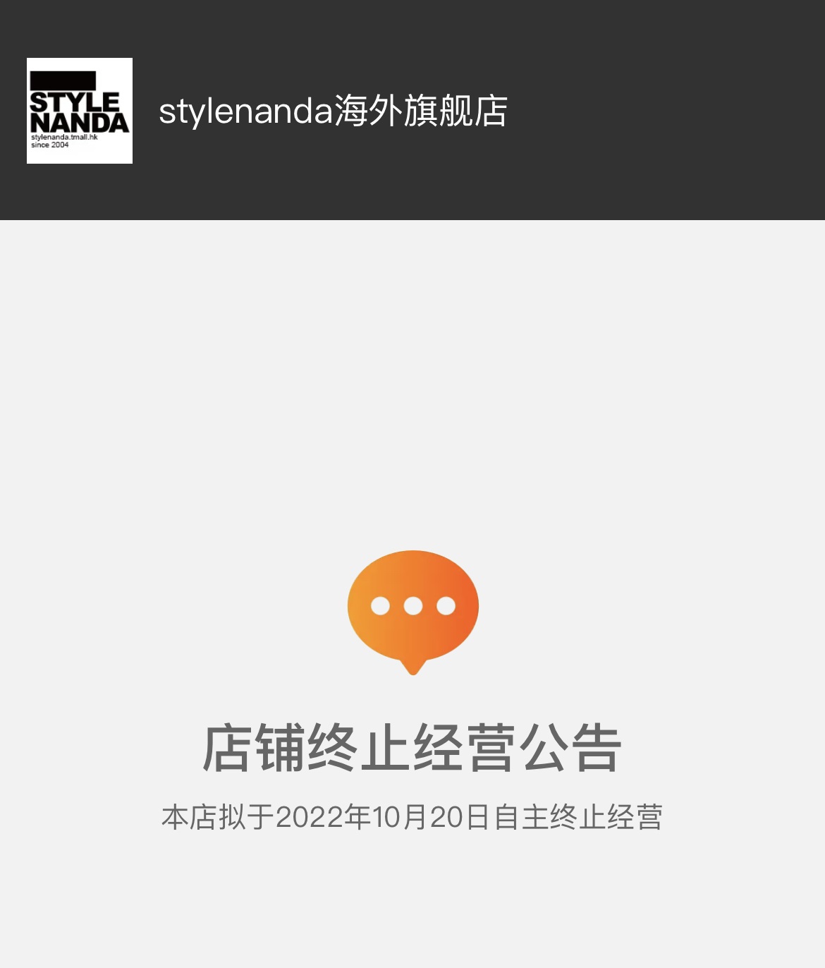 同時(shí)宣布關(guān)停的,還有Stylenanda天貓海外旗艦店,宣布計(jì)劃將于10月20日終止運(yùn)營(yíng)。