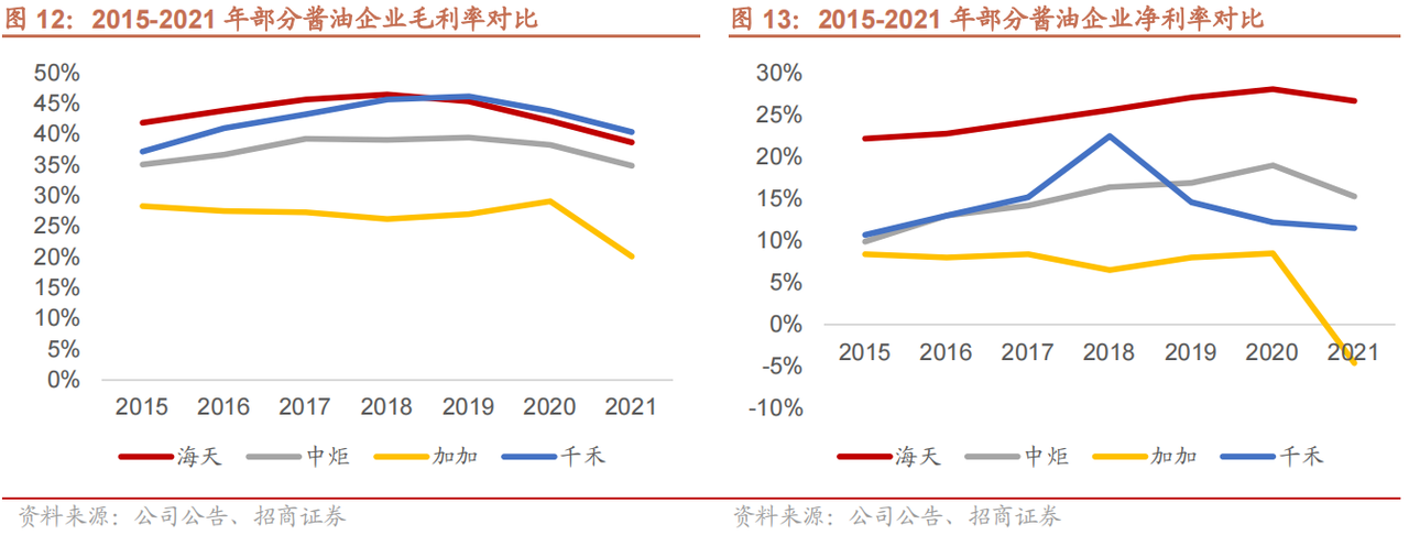 支撐海天業(yè)績穩(wěn)定增長的,是海天的高毛利和高凈利。根據(jù)招商證券數(shù)據(jù),海天的毛利率在近6年都保持在40%左右,處在行業(yè)領先的位置。又因為海天味業(yè)品牌效應強、用戶粘性高、具備渠道優(yōu)勢,海天味業(yè)的四大費用比同行要低很多。比如2021年期間費用率只有4.7%,同行在20%以上。因此,海天在凈利率上有絕對優(yōu)勢。