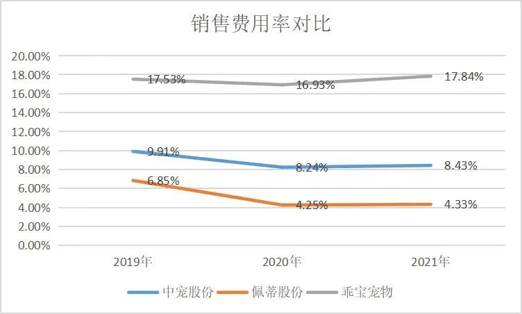 因此,乖寶寵物銷售費(fèi)用也在逐年增高。2019年到2021年,公司的銷售費(fèi)用分別為2.46億元、3.41億元和4.59億元,對應(yīng)的銷售費(fèi)用率分別為17.53%、16.93%和17.84%,高于同行可比企業(yè)。