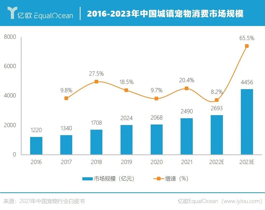 中國(guó)畜牧業(yè)寵物產(chǎn)業(yè)分會(huì)指導(dǎo)的《2021年中國(guó)寵物行業(yè)白皮書》顯示,中國(guó)城鎮(zhèn)家庭寵物貓的數(shù)量為5806萬(wàn)只、寵物犬的數(shù)量為5429萬(wàn)只,合計(jì)超過1.1億只;2021年全國(guó)城鎮(zhèn)寵物消費(fèi)市場(chǎng)規(guī)模達(dá)到2490億元,預(yù)計(jì)到2023年將進(jìn)一步增長(zhǎng)至4456億元。