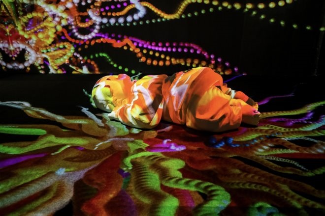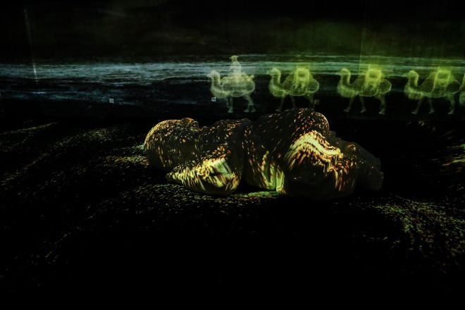 據(jù)介紹,光影藝術(shù)是現(xiàn)階段較為接近元宇宙概念的體驗(yàn)?zāi)J,體驗(yàn)者可以實(shí)現(xiàn)裸眼、無穿戴設(shè)備的實(shí)時(shí)近身體驗(yàn)。本次展覽借助創(chuàng)意科技,彌合時(shí)間與空間的間隙,攫取流動(dòng)著的萬千奇景,通過第一視角的沉浸式光影體驗(yàn),模仿大地之子的真實(shí)“夢境”,流沙、宇宙、深海、碧空……讓觀展者置身其中,感受亙古天地間人的渺小與夢的強(qiáng)大,喚醒人們對(duì)夢境、夢想與信仰的感知與體悟。