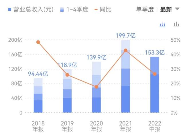 山西汾酒2018年至2022年上半年的營業(yè)收入為94.44億元、118.9億元、139.9億元、199.7億元、153.3億元,一路追趕營收超越了瀘州老窖。