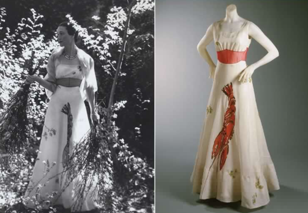 這種形式堪稱是品牌聯(lián)名的祖師爺。早在1937年,意大利設(shè)計師Elsa Schiaparelli突發(fā)奇想,找來達(dá)利一起做了一條龍蝦印花裙,瘋狂的達(dá)利再加上與時尚不沾邊的食材元素,這條橫空出世的裙子讓整個時尚圈為之振奮。彼時的著名KOL溫莎公爵夫人立馬成為龍蝦裙的擁躉,經(jīng)其發(fā)揚光大,龍蝦裙得以名垂時尚史。