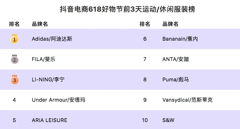 早期和抖音牽手的阿迪達(dá)斯,就像過去的優(yōu)衣庫之于淘系,為抖音開拓服裝品類打頭陣。今年618好物節(jié)前3天的運動休閑服裝榜上,阿迪達(dá)斯、斐樂、李寧等品牌霸榜,和同期天貓的運動服裝榜單上榜品牌無異。優(yōu)衣庫目前在抖音平臺處于起步階段,但直播頻次和時長并不亞于其他品牌,“掌上優(yōu)衣庫”賬號不到一個月漲粉40多萬。