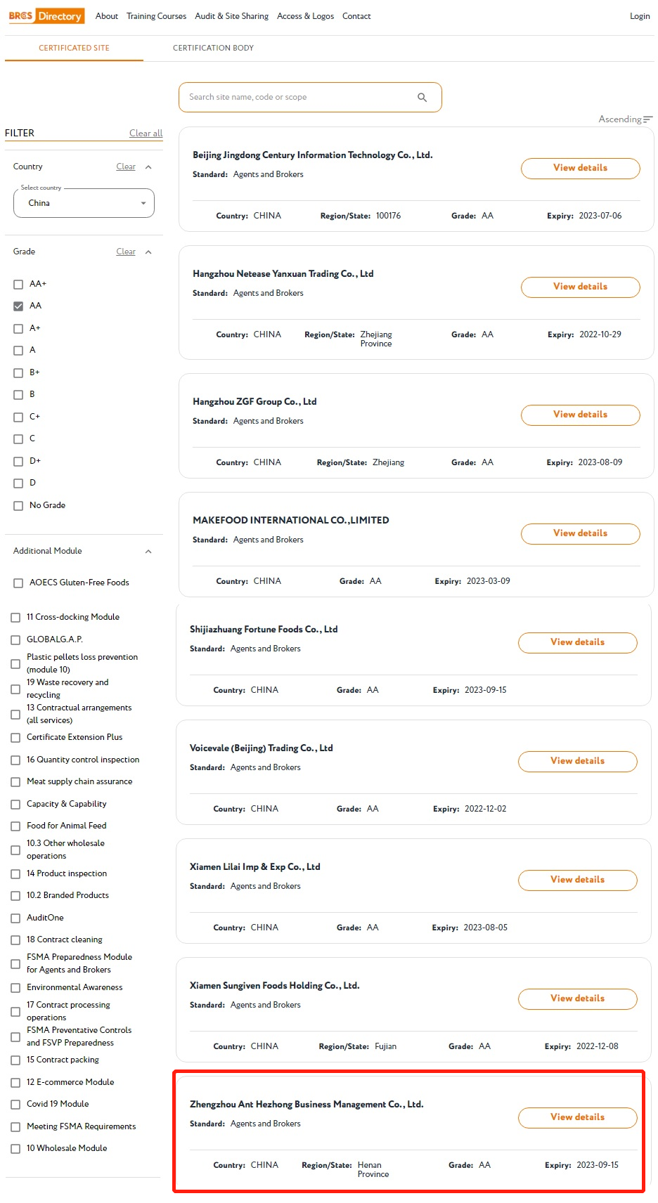 截至2022年10月,BRCGS官網(wǎng)上公布的全球BRCGS A&B認證企業(yè)共有751家,中國僅有57家企業(yè)通過認證,其中等級達到AA級的企業(yè),全球共有598家,中國僅有9家,京東商城、網(wǎng)易嚴選、元初食品等知名企業(yè)均在其列。