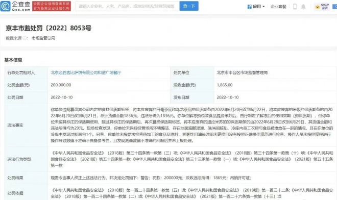 企查查APP顯示,10月10日,北京必勝客比薩餅有限公司和諧廣場餐廳因違反《食品安全法》,被北京市豐臺(tái)區(qū)市場監(jiān)督管理局罰款20萬元,沒收違法所得1865元,并被吊銷許可證。