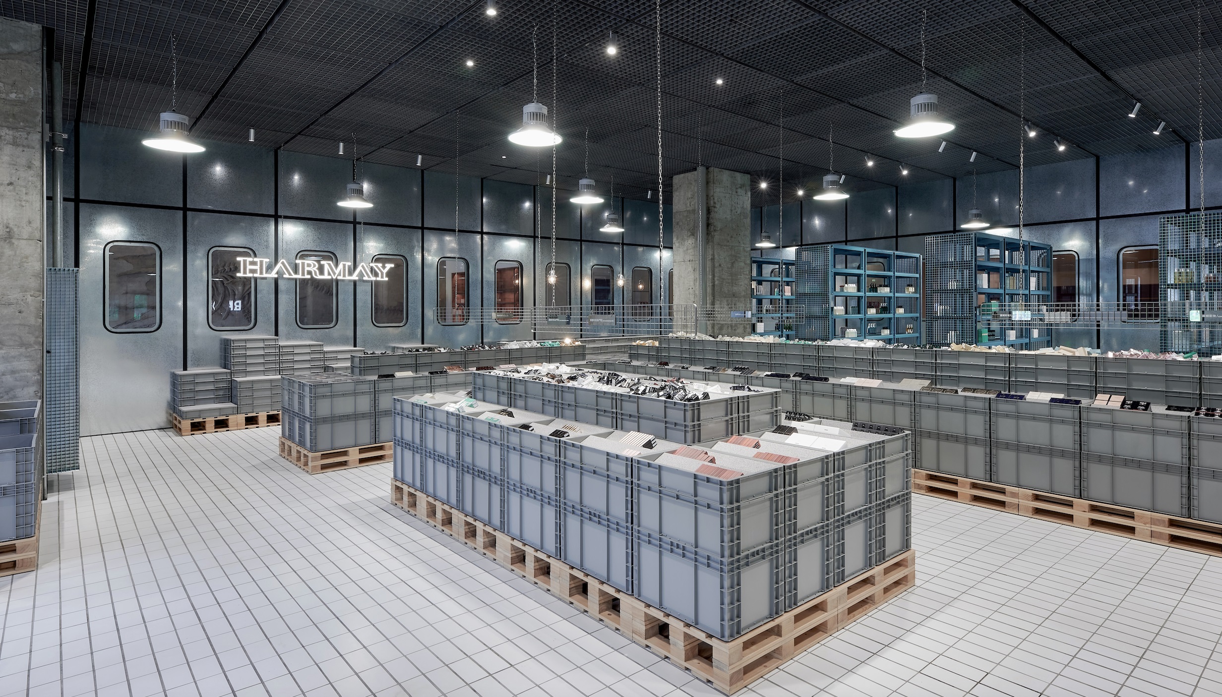HARMAY 話梅成都悠方店,延續(xù)一如既往的倉儲文化以及“一店一設”設計理念,將倉儲空間細節(jié)結合店鋪格局陳列,打造便利場景化的購物空間。店鋪入口從倉庫折疊門演變重設,鏈接模塊化的門板構建可變形的商業(yè)入口邊界。店內陳列貨架則受到大宗貨物轉運時所需工具啟發(fā),用區(qū)域堆疊貨框的形式把產品以話梅獨有的貨物排列邏輯,呈現出豐富清晰的視覺觀感。