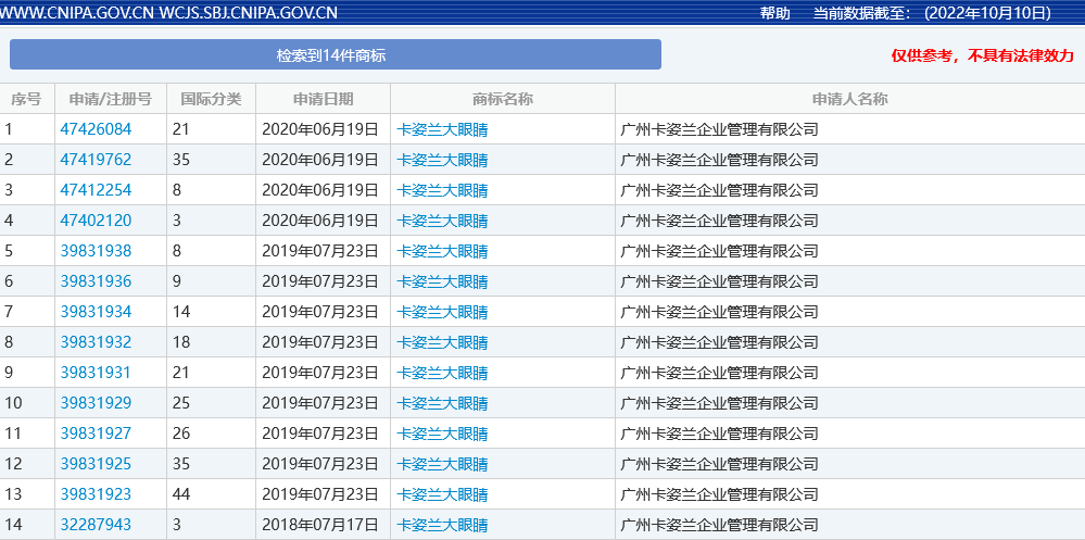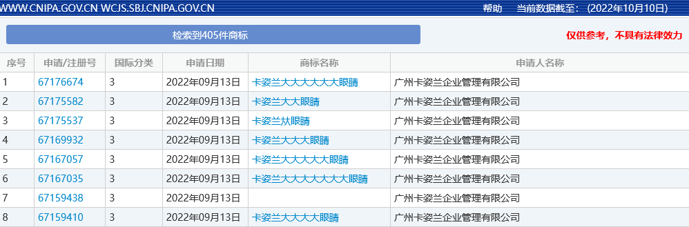 9月13日,廣州卡姿蘭企業(yè)管理有限公司(下稱: 廣州卡姿蘭)密集提交8項(xiàng)商標(biāo)申請(qǐng),據(jù)中國(guó)商標(biāo)網(wǎng)顯示,除其中一項(xiàng)因正在受理中無(wú)法展示,其余七項(xiàng)均為與“卡姿蘭大眼睛”相似的商標(biāo)名稱,且目前均處于等待實(shí)質(zhì)審查階段。