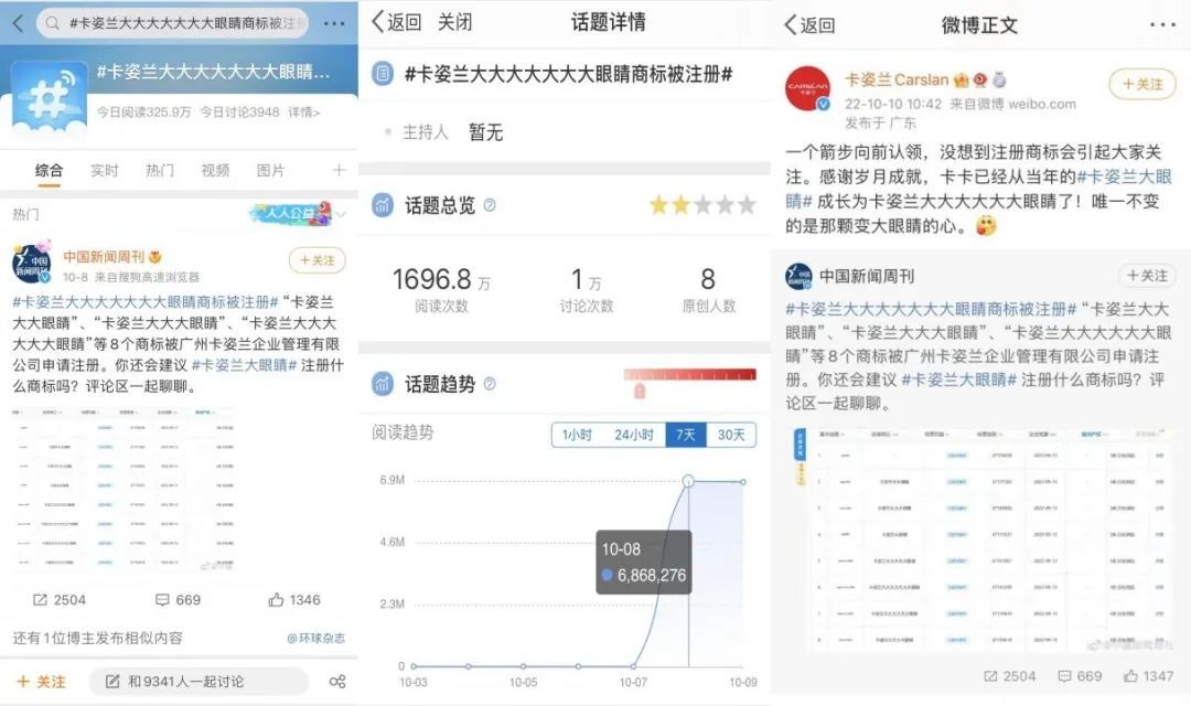 據(jù)青眼觀察,“卡姿蘭大大大大大大大眼睛商標(biāo)被注冊(cè)”微博話題獲得了1696.8萬(wàn)次閱讀,參與討論次數(shù)也達(dá)到一萬(wàn)次,話題熱度的高漲讓卡姿蘭Carslan官博都主動(dòng)出來(lái)“認(rèn)領(lǐng)”。此次討論將曾經(jīng)的國(guó)民記憶“卡姿蘭大眼睛”再一次帶入了人們的視野,幽默的商標(biāo)名稱,官博的及時(shí)互動(dòng),拉近了品牌與消費(fèi)者的距離。