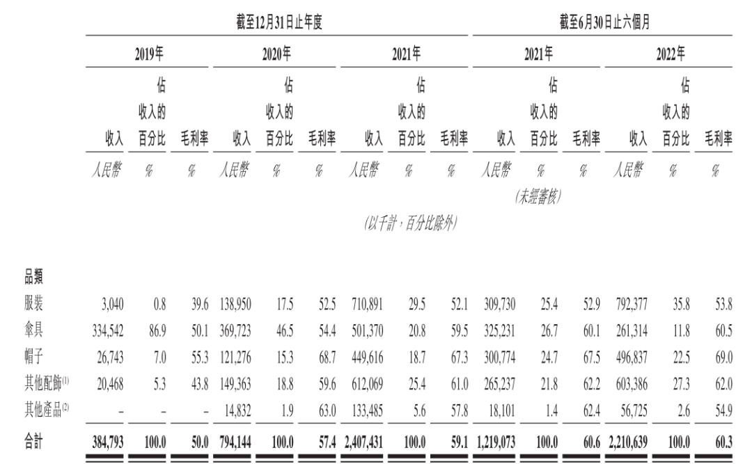 其中包括口罩、袖套、墨鏡、手套、披肩及圍巾在內(nèi)的其他配飾,上半年?duì)I收超過6億元,同比增長127.5%。由于加大上新力度,半年時間推出46款新品,同時提高客單價,其他配飾類已經(jīng)成為僅次于服裝的第二大收入來源,在總營收的占比接近3成。這部分產(chǎn)品的毛利率高達(dá)62%,比服裝更高。