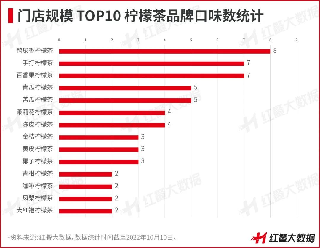 基于此,鴨屎香檸檬茶等爆款產(chǎn)品在諸多檸檬茶門店均有售賣。紅餐大數(shù)據(jù)顯示,在全國檸檬茶門店數(shù)量TOP10品牌中,鴨屎香檸檬茶出現(xiàn)的頻次最高,而提供手打檸檬茶和百香果檸檬茶的品牌各有7個,提供青瓜檸檬茶和苦瓜檸檬茶的品牌各有5個,產(chǎn)品口味較為集中。