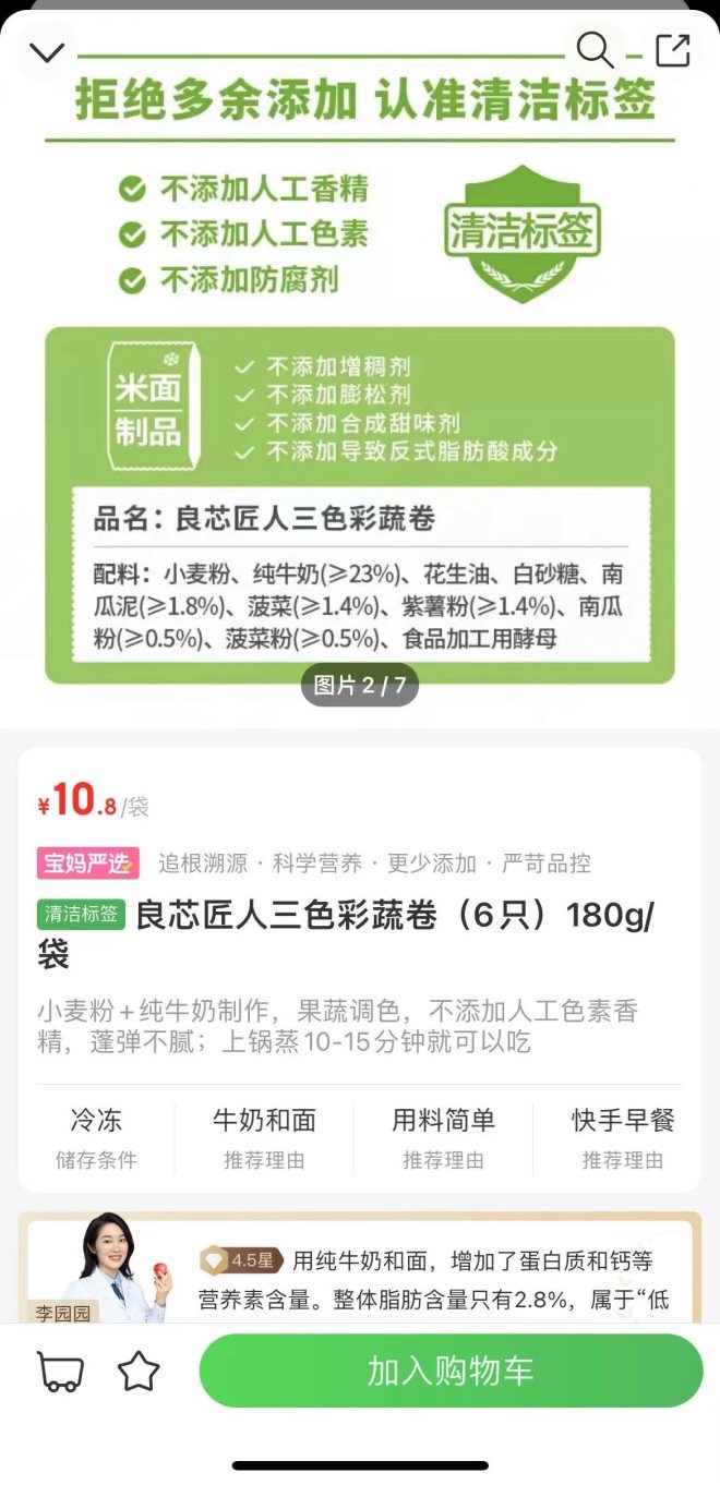 例如,叮咚買菜自有品牌“良芯匠人”的一款“三色彩蔬卷”頁(yè)面顯示,米面制品在以上通用原則的基礎(chǔ)上,還需符合“不添加增稠劑、不添加膨松劑、不添加合成甜味劑、不添加導(dǎo)致反式脂肪酸成分”四項(xiàng)要求。