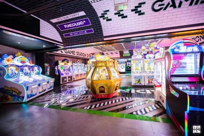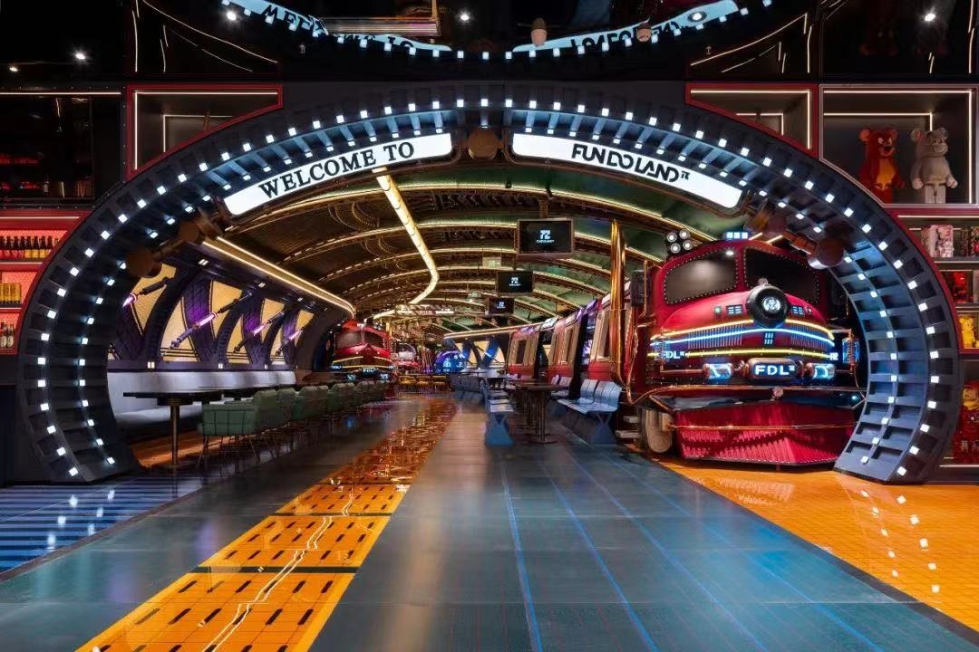 首店門口處整齊排列著酒柜和潮玩柜,入口處直走就是隧道餐吧,餐吧一側擺放著「盜夢列車」,保齡場館則被設計成復古站臺,旁邊一側?恐鴱凸帕熊嚕琇iveHouse酒吧則由好聲音歌手和300+款酒組成,電玩區(qū)包含各種電玩設備,閃爍的紅綠霓虹燈光,讓游客仿佛置身于游戲中的虛擬世界。