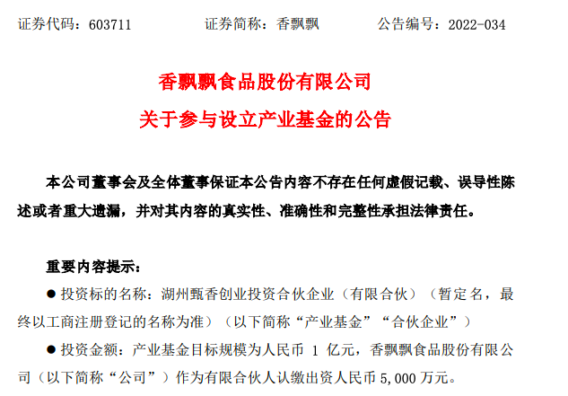 具體來看公告。香飄飄10月12日發(fā)布公告表示,公司于10月11日與上海嘉尋資產管理合伙企業(yè)(有限合伙)簽訂了《湖州甄香創(chuàng)業(yè)投資合伙企業(yè)(有限合伙)有限合伙協(xié)議》,擬共同出資設立產業(yè)基金,產業(yè)基金目標規(guī)模為人民幣1億元。