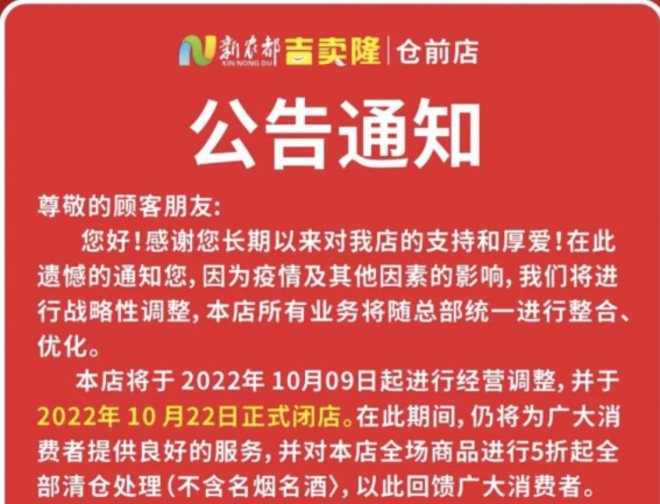 10月14日消息,新農(nóng)都吉賣(mài)隆杭州倉(cāng)前店將于10月22日正式閉店。
