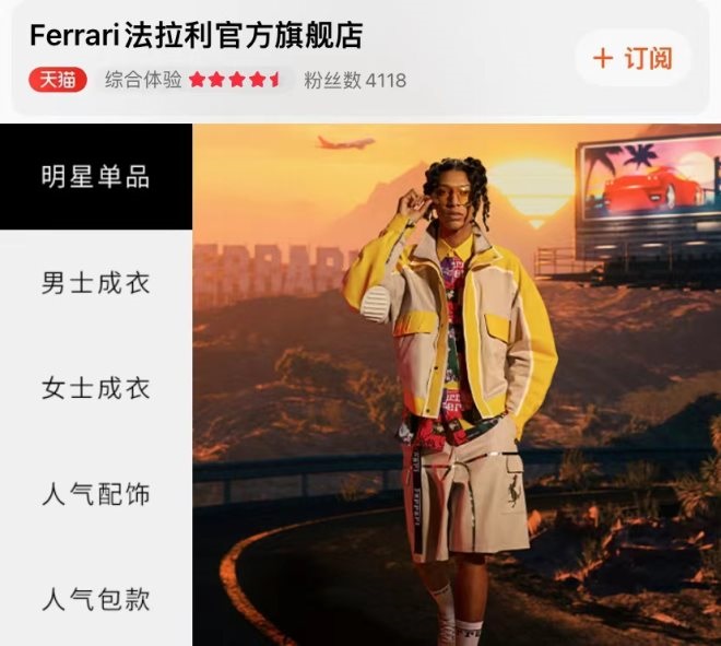 近日,F(xiàn)errari法拉利登陸天貓,開出中國首家官方服裝(網(wǎng))店,銷售產(chǎn)品主要圍繞高級(jí)時(shí)裝與配飾,并將于10月24日開啟預(yù)售。