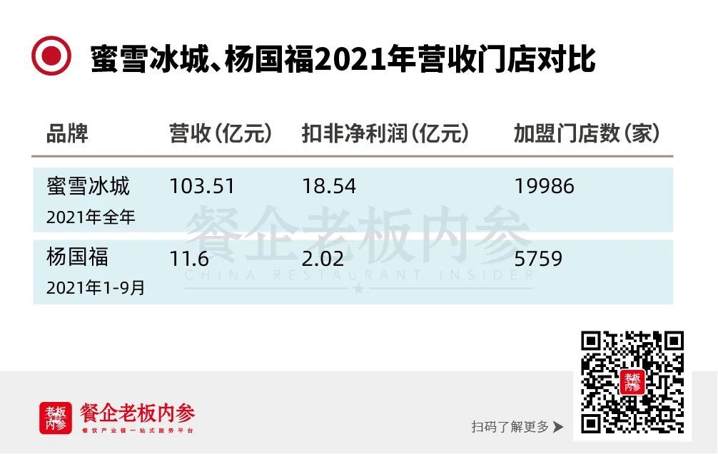 同樣是做供應(yīng)鏈做加盟的蜜雪冰城,2021年營收103.51億,扣非凈利潤18.54億,加盟門店數(shù)近20000家。而楊國福去年前三季度營收為11.6億、凈利潤2.02億元,截至去年9月30日,共有5759家加盟店。另外關(guān)閉餐廳數(shù)量也不可輕視,其中2019年關(guān)閉餐廳數(shù)量超過新加盟數(shù)量。