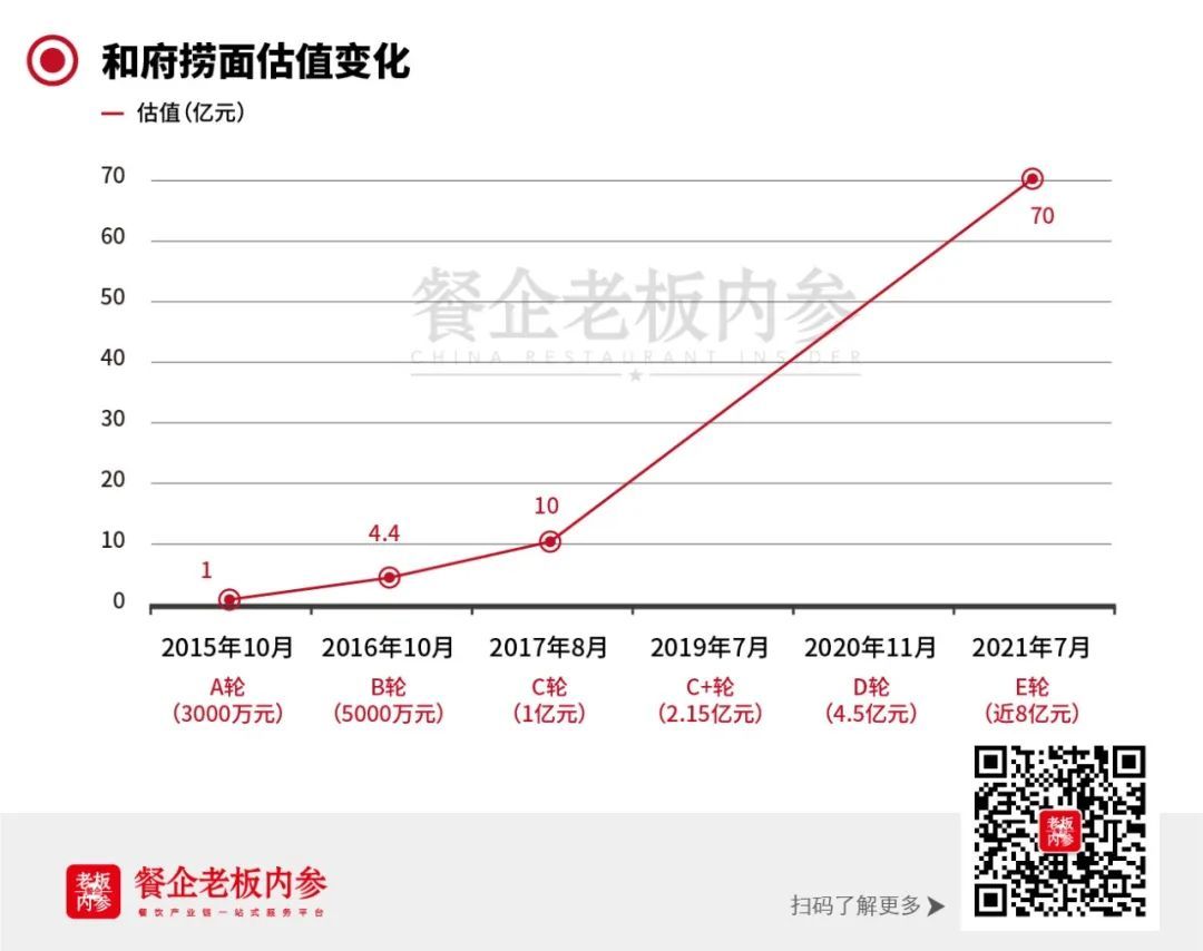 2021年E輪融資之后,和府撈面估值達到70億元。從「E」可以看出,和府撈面和資本關(guān)系密切,幾乎保持了一年融一輪的節(jié)奏。公開信息顯示,和府撈面已完成6輪融資。其背后的資本有騰訊投資、CMC、龍湖資本等,絕味旗下的網(wǎng)聚資本也曾投資過和府撈面(現(xiàn)已退出)。