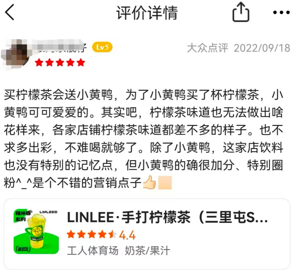 LINLEE還送購(gòu)買(mǎi)茶飲的用戶(hù)小黃鴨玩具。大眾點(diǎn)評(píng)上,有不少用戶(hù)稱(chēng)自己是沖著小黃鴨來(lái)消費(fèi)!俺诵↑S鴨,這家店飲料也沒(méi)有特別的記憶點(diǎn),但小黃鴨的確很加分、特別圈粉!庇杏脩(hù)評(píng)論道。