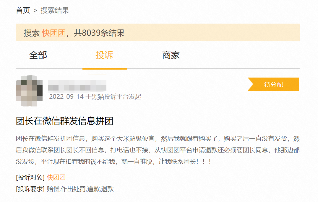 獨(dú)立運(yùn)營(yíng)的快團(tuán)團(tuán),整個(gè)小程序的開(kāi)發(fā)會(huì)更加具有獨(dú)立性和針對(duì)性,那就是“工具屬性”,快團(tuán)團(tuán)不需要去考慮基于拼多多的內(nèi)容穩(wěn)定性。但快團(tuán)團(tuán)的負(fù)面影響也不可忽視:低準(zhǔn)入門(mén)檻會(huì)造成貨源問(wèn)題,團(tuán)購(gòu)也是完全依賴團(tuán)長(zhǎng)信譽(yù)度進(jìn)行,平臺(tái)沒(méi)有賬期,也不擔(dān)保交易,售后和履約是最大問(wèn)題。在 “黑貓投訴”上,關(guān)于“快團(tuán)團(tuán)”的投訴達(dá)8000多條,不少是團(tuán)長(zhǎng)不發(fā)貨和收到虛假產(chǎn)品。