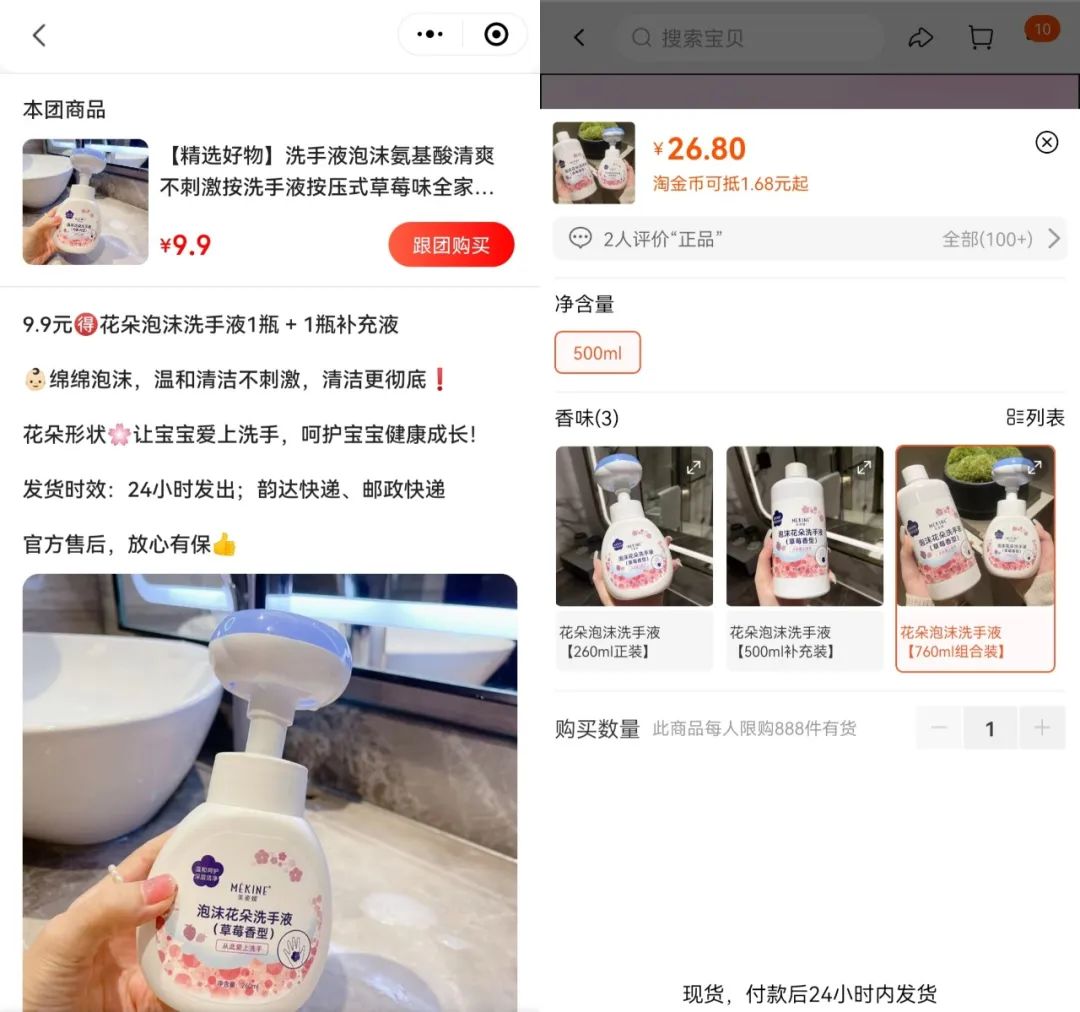 雖然標(biāo)榜“比京東更便宜”,但并不一定比其他平臺(tái)便宜。東咚團(tuán)上,泡沫花朵洗手液和補(bǔ)充裝的價(jià)格在9.9元,同款商品在京東平臺(tái)上售價(jià)為35.8元,淘寶售價(jià)為26.8元,拼多多售價(jià)為21.4元,確實(shí)是全網(wǎng)最低價(jià)。但東咚團(tuán)中團(tuán)購(gòu)的泉陽(yáng)泉礦泉水價(jià)格在57.6元,相同規(guī)格的商品在淘寶上只需要44元。