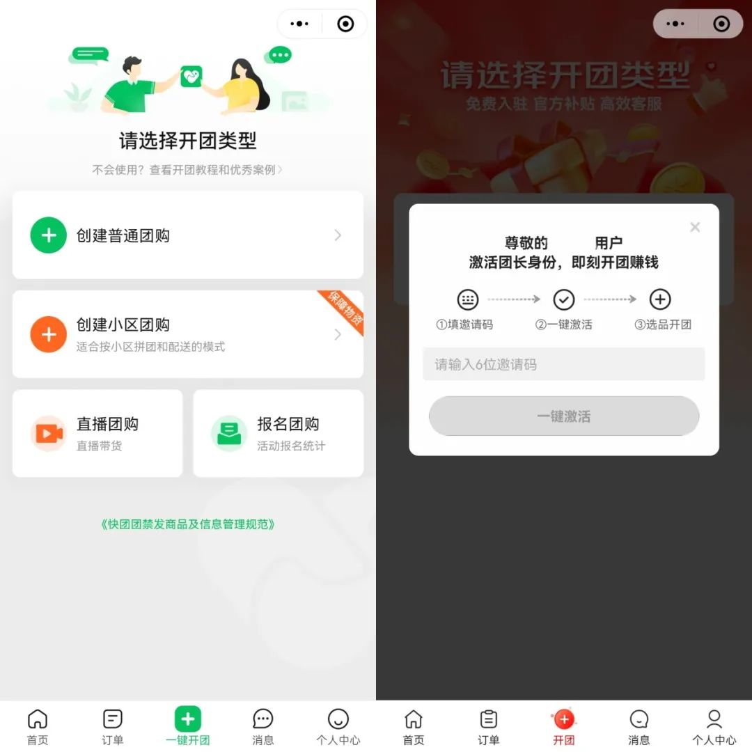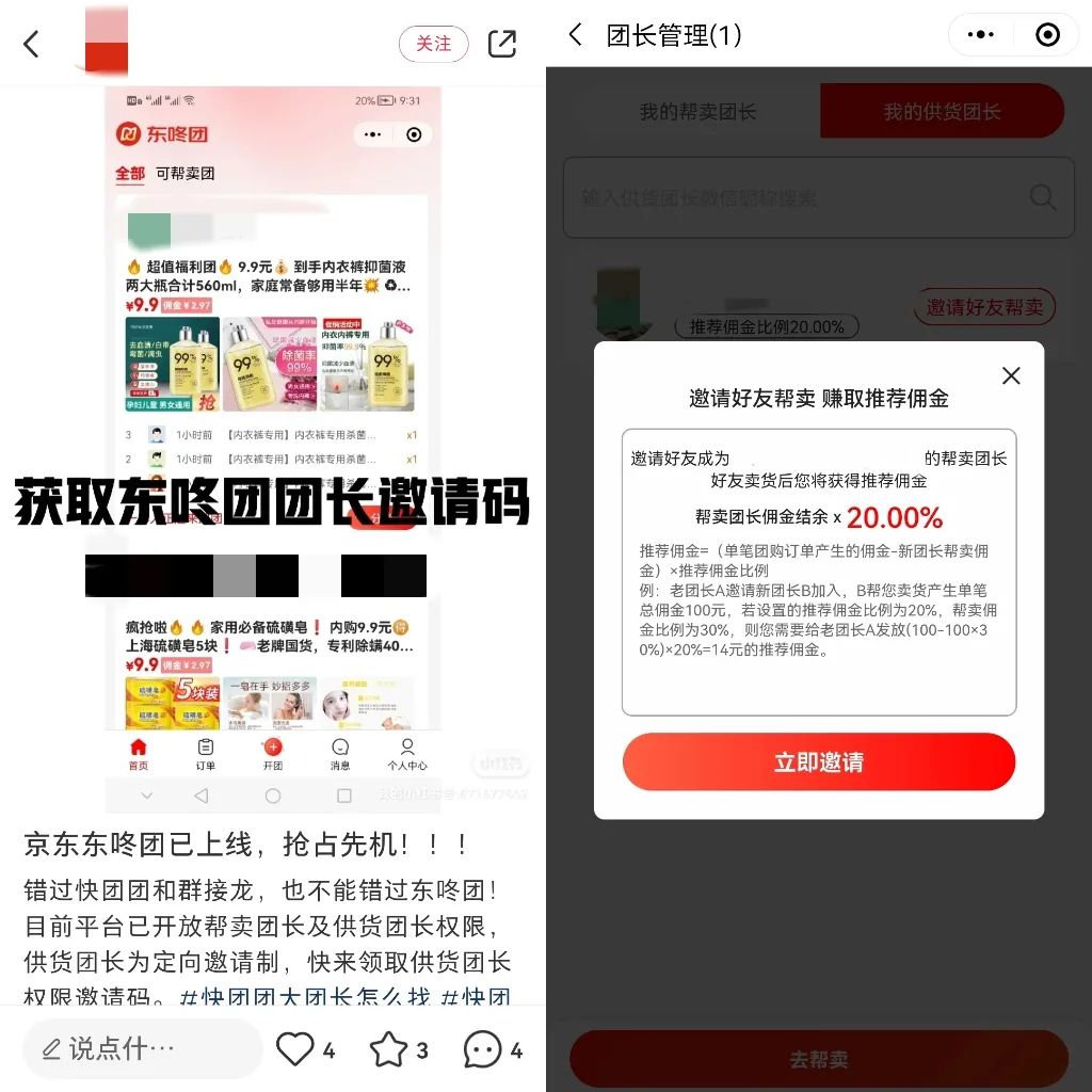第一,團(tuán)長(zhǎng)準(zhǔn)入門(mén)檻高,但選品能力要求更低。相比于快團(tuán)團(tuán)的“人人都能開(kāi)團(tuán)”,東咚團(tuán)的團(tuán)長(zhǎng)采用定向邀請(qǐng)和邀請(qǐng)碼制度,只有少部分人能成為團(tuán)長(zhǎng)。相比于快團(tuán)團(tuán)需要團(tuán)長(zhǎng)尋找貨源,東咚團(tuán)有著官方直接提供的商品池,減少了團(tuán)長(zhǎng)和商家互相選擇所花費(fèi)的精力和時(shí)間;
