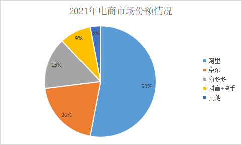 在電商領域,美團需要和阿里、京東以及拼多多、抖音電商等主流電商平臺角逐,這一市場的贏面又有多大呢?有研究報告指出,2021年電商市場上,阿里一家占了一半多份額(53%),剩下的份額由京東、拼多多、快抖占據(jù),份額分別為20%、15%、9%,這也意味著,接近9成的市場已經(jīng)被“先入者”瓜分,是一個非常典型且成熟的紅海市場。