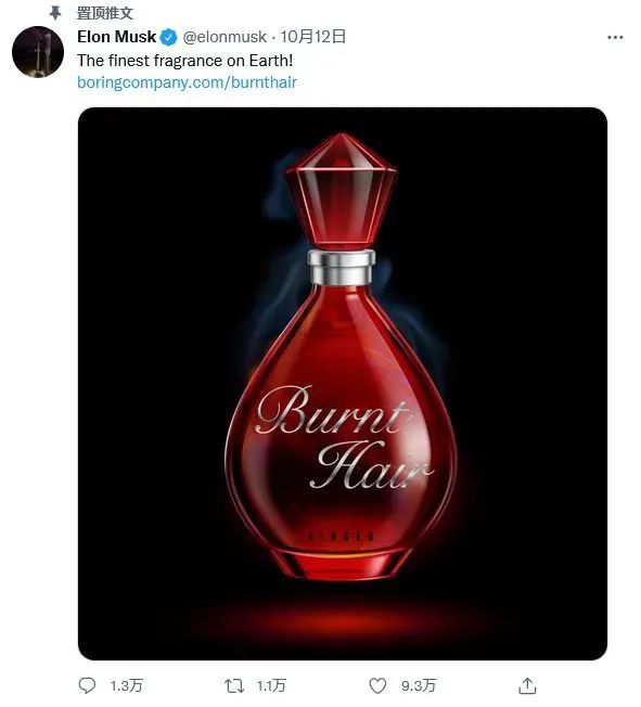 而在10月12日正式發(fā)布“BURNT HAIR”香水后,截至目前,馬斯克接連發(fā)了十余條關(guān)于香水的動(dòng)態(tài),除向消費(fèi)者推薦此款香水外,馬斯克還發(fā)表了一連串感想,“已經(jīng)迫不及待看到明天香水銷售破百萬美元的新聞了”,他甚至調(diào)侃道,“請(qǐng)買我的香水,這樣我就可以買到推特了!