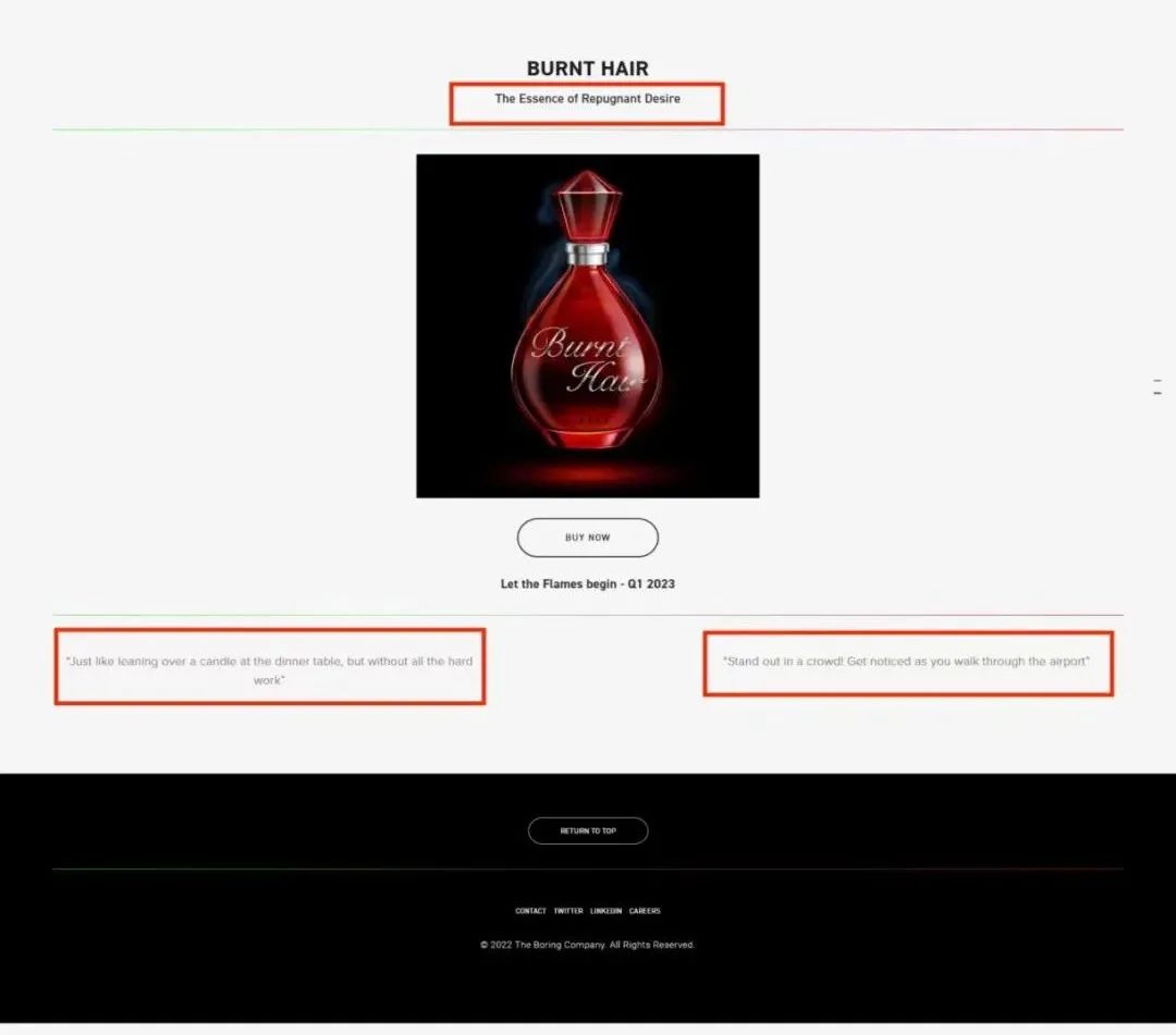 青眼發(fā)現(xiàn),該款香水上架于馬斯克旗下鉆地公司(Boring Company)官方網(wǎng)站,并占據(jù)官網(wǎng)首頁的位置。這一系列動(dòng)作來看,似乎這次馬斯克又動(dòng)了真格。