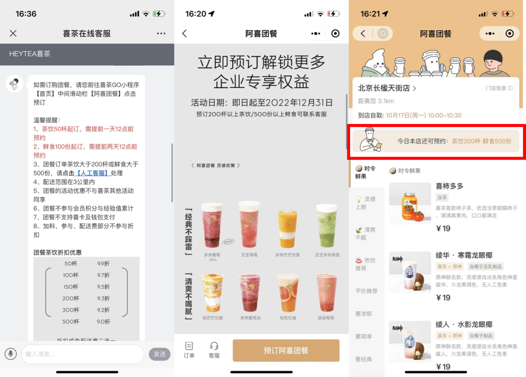 喜茶可以在小程序直接預(yù)訂,考慮到備料和產(chǎn)能的情況,飲品需要提前一天,鮮食產(chǎn)品需要提前。喜茶還給門店設(shè)置了預(yù)約限額來(lái)保證出品。由于喜茶在一線城市的密度大,外賣會(huì)根據(jù)門店的單量和制作情況進(jìn)行訂單分配,因此外賣的總產(chǎn)能也不會(huì)受到影響。