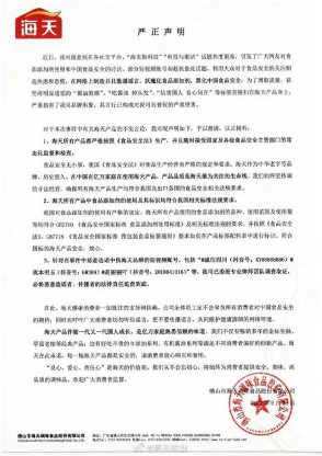 這場(chǎng)狂歡中,曾經(jīng)被譽(yù)為“”醬油茅臺(tái)”的海天味業(yè)(下文簡(jiǎn)稱“海天”)被千夫所指。而公司官方傲慢的“嚴(yán)正聲明”、“以正視聽”,讓網(wǎng)友進(jìn)一步加足了火力。