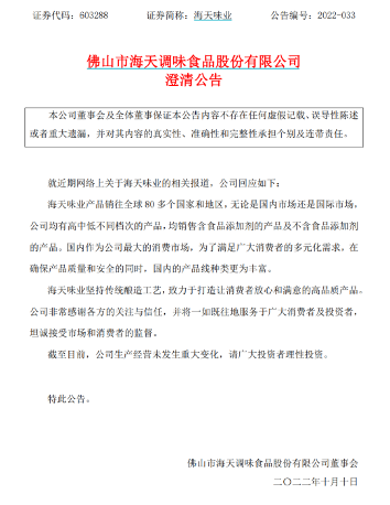 10月9日晚,海天的第三份《澄清公告》發(fā)出,這一次沒了情緒和對(duì)抗,只是客觀的陳述“公司均有高中低不同檔次的產(chǎn)品,國(guó)內(nèi)外均銷售含食品添加劑的產(chǎn)品及不含食品添加劑的產(chǎn)品。在確保產(chǎn)品質(zhì)量和安全的同時(shí),國(guó)內(nèi)的產(chǎn)品線種類更為豐富”的事實(shí),顯得穩(wěn)重、大氣了很多。