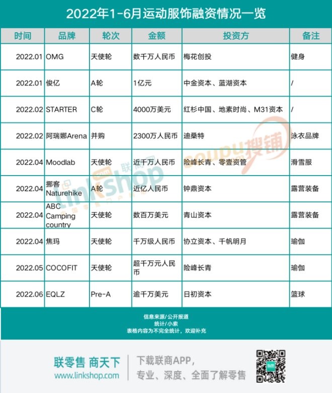 據聯商網不完全統(tǒng)計,上半年運動服飾領域共發(fā)生12起融資事件,融資金額超9億元,主要集中在天使輪。億元以上的融資共3起,規(guī)模最大的是今年2月運動品牌STARTER完成的C輪融資,由紅杉中國、地素時尚以及M31資本聯合投資,總計金額4000萬美元,除此之外,露營品牌挪客Naturehike和運動品牌俊億均在上半年完成A輪融資,獲得1億資金。