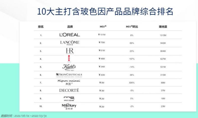 根據(jù)《PARKLU護(hù)膚品牌營銷洞察報(bào)告》對2021年8月1日至2022年3月31日的市場統(tǒng)計(jì),在10大主打含玻色因原料的產(chǎn)品品牌綜合排名中,歐萊雅集團(tuán)旗下巴黎歐萊雅、蘭蔻、赫蓮娜、羽西、科顏氏、修麗可分別排名前六位。