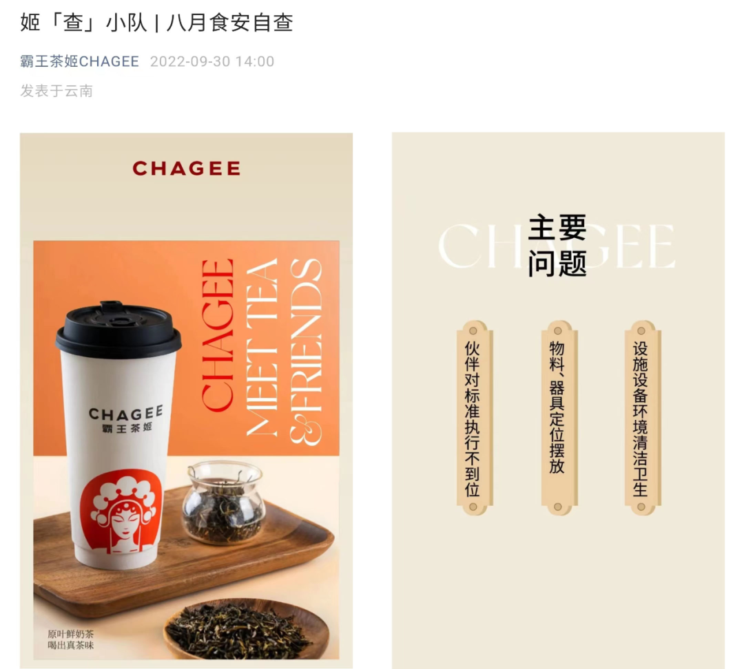 霸王茶姬也在今年八月正式啟動「“姬”查小隊」,當(dāng)月稽核415次、安全培訓(xùn)415次,全面整改從物料擺放、客區(qū)垃圾清理、器械積垢等多個食安問題。